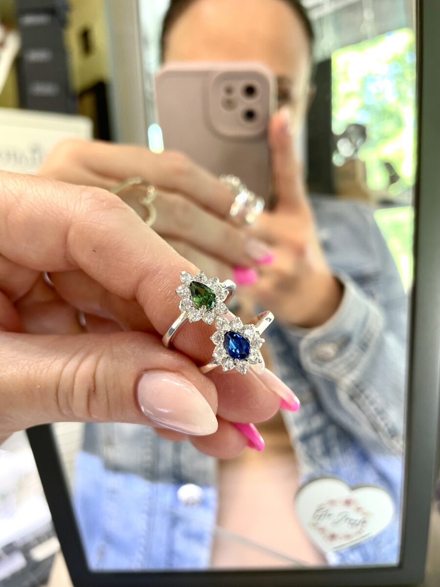 • Caratteristiche: anello modello goccia, pietra centrale colorata e contorno di zirconi bianchi.
