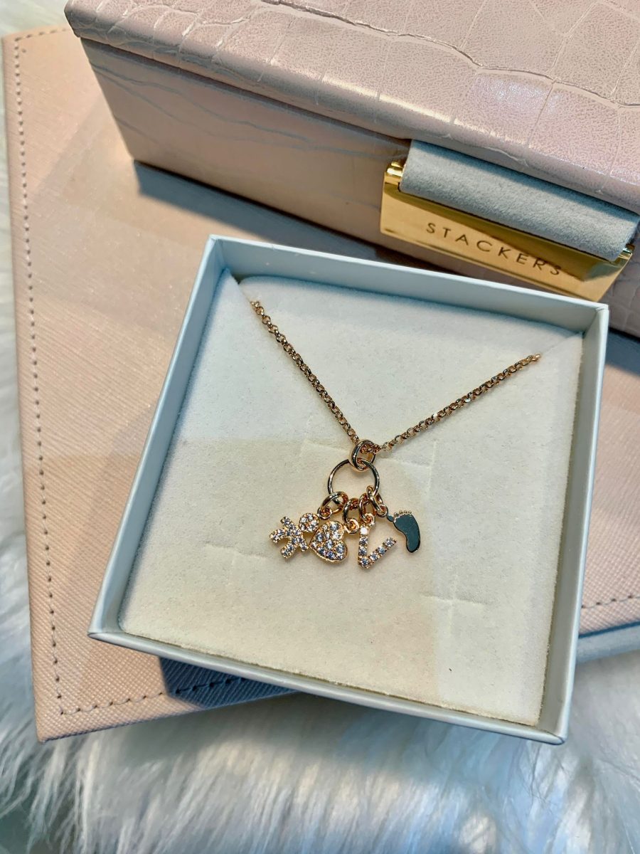 Collana Love Family con ciondoli mini bimbo/a, cuore o letterina (tutti con zirconi bianchi) e mini piedino lastra liscio.