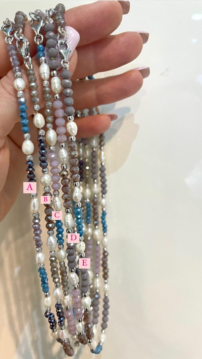 Collana pietre, perline acqua di fiume e perline argento. Moschettone come chiusura in argento.